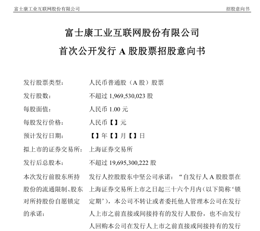 5月14日,富士康正式在上交所官网披露《首次公开发行A股股票招股意向书》,发行安排及初步询价公告。其股票简称“工业富联”,股票代码为“601138”,网下、网上申购时间为5月24日,中签号公布日为5月28日。