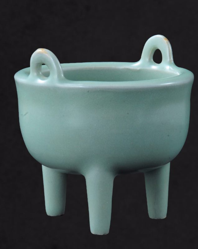 南宋龙泉窑天青釉鼎式琴炉:器型相当规整饱满,形态线条流畅,釉色肥厚呈玉质感,品相一流,空蕊三足拉坯更少见,是南宋龙泉琴炉精品和代表作,也是皇宫贵族抚琴用焚香器。这样没有任何残缺的品相市场绝无仅有,是博物馆展示品。